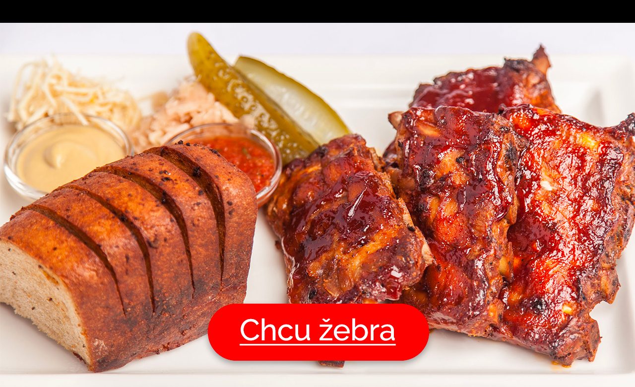 600g Pečených žeber v naší marinádě, hořčice, okurka..